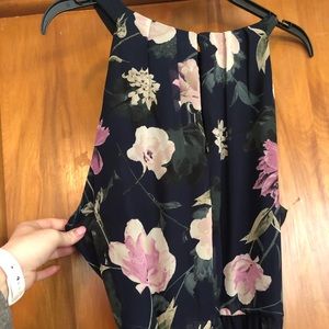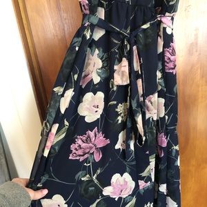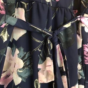 High neck navy floral dress! Ties around the waist making it super flattering and the upper back has a zipper. I’m 5’8” and it hit the floor on me perfectly. No longer my size. Only worn once! Zero flaws. Purchased from Macy’s a year ago.