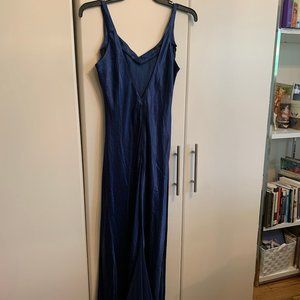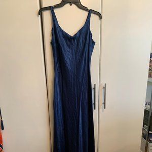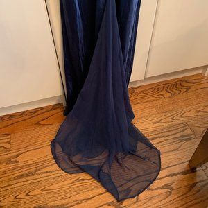 Floor length with blue chiffon train, 54% Rayon, 46% Acetate, some wear, some stains