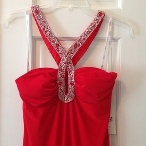 Bright red with silver beading. Halter top and open back. One slit on the left side