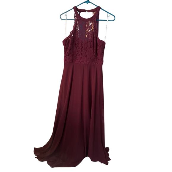 This stunning floor-length formal dress is perfect for your next special occasion! It features a flattering halter neckline and a rich maroon color that's sure to turn heads.