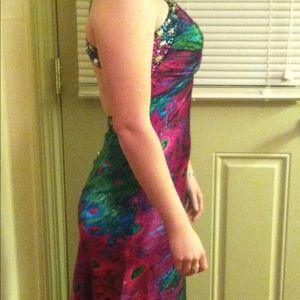 Peacock multicolor floor length with beading around neckline and back. Tag says size 2 but I'm a dress size 4/6. Will take best offer