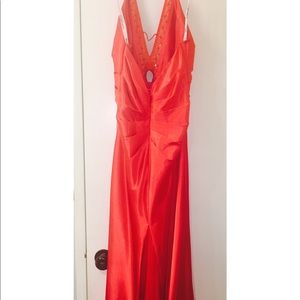 Floor length red dress with front cut-out, decorated in sequins. Has an open back with full functioning zipper along the side. It has only been worn once- great for prom or other special occasion!
