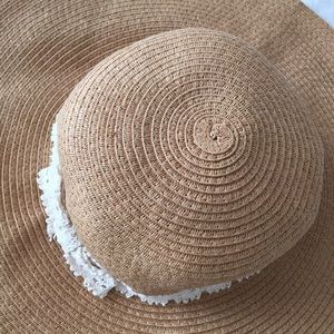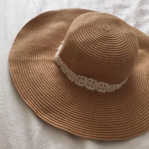 Made of of straw like material! Super cute to pair with a spring, summer, or FALL outfit!! It has some bucks on the top but I'm positive it was there when I purchased it... I wore it once so it needs a loving home to go to haha :)