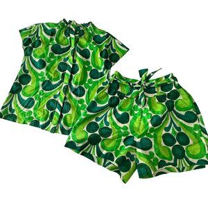 This Flora Bea set in vibrant green and white features a Camren top and matching shorts with pockets, made from breathable cotton voile. Ideal for warm weather, the set provides a stylish, cohesive look with a relaxed fit. The eye-catching pattern adds a fresh and lively touch to your ensemble.