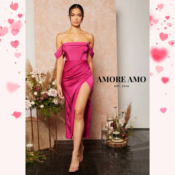 ❤️ Flora ❤️ Dress - Hug Hip Shell Pink Rose Flushed Ruched Satin Off Shoulder