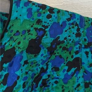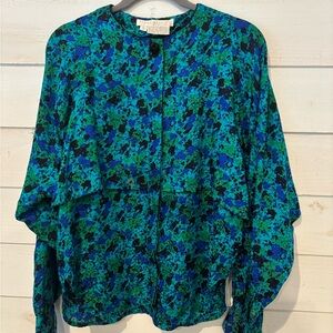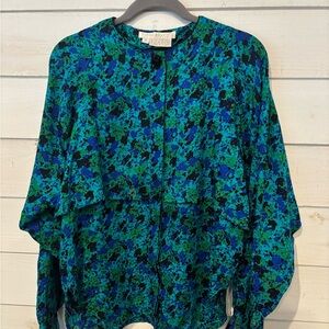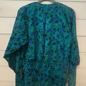 Stylish blouse with a vibrant blue and green pattern. Perfect for adding a pop of color to your wardrobe.