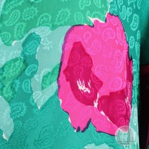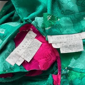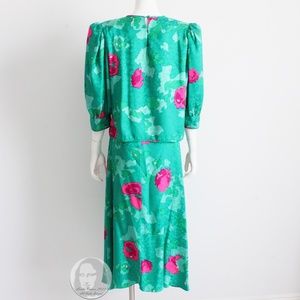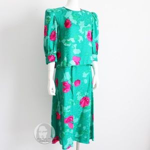 Authentic, preowned, vintage 80s blouse and skirt set by Flora Kung New York. Made from a gorgeous abstract silk jacquard fabric, the blouse has shoulder pads, half sleeves and fastens in the back with two silk covered buttons. The matching maxi skirt features a high waist and fastens with a zipper and button. Both pieces unlined/dry clean only. If you enjoy abstract prints, you'll love this set! Absolutely eye-popping colors and so easy to style together or separately! Preowned/vintage (40+ years old) with minimal signs of use and prior wear: some wrinkles from storage, would benefit from a professional steaming. Tagged size 8. Approximate measurements (taken flat and doubled where appropriate). Blouse: shoulders - 17in, bust - 38in, waist - 28in, sleeves - 20in. Skirt: waist - 28in, hips - 39in, length - 38in.