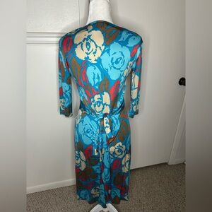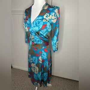 Excellent condition elegant wrap dress features a sophisticated blue color palette, complemented by a flattering V-neckline and 3/4 sleeves. 100% silk Ideal for both casual and work settings, its sleek design offers a refined and versatile look. The tailored fit ensures a polished appearance for any occasion.