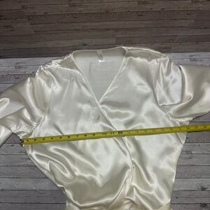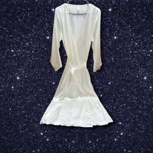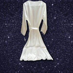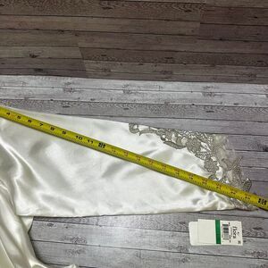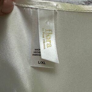 Women’s Luxurious cream satin robe by Flora Nikrooz. With special embroidered sleeves Perfect for elegant lounging.size L/XL measure pit to pit 20” shoulder from down 54” long sleeve 23’1/2 New W/Tags
