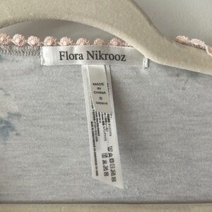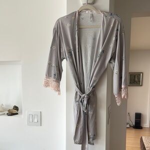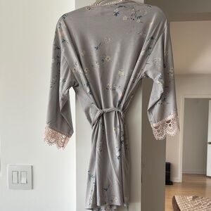 Indulge in the luxurious comfort of this Flora Nikrooz robe, featuring a soft gray fabric with delicate pink lace trim. Designed with 3/4 length sleeves and a tie belt, this robe offers a relaxed fit perfect for lounging. Enjoy the classic silhouette and elegant details for a touch of sophistication in your loungewear collection. Colors are gray with a light pink/peach trim detail and blue and green printed florals. This has been worn and washed but is still in good condition.