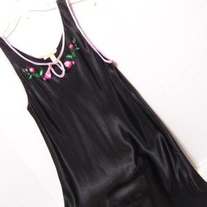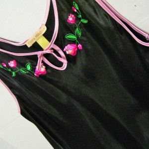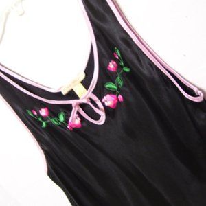 Flora Nikrooz Long Black Sexy Nightgown with Embroidery NWOT . Flora Nikrooz, Black Satin, Long Night Gown, Trim Pink Satin, Embroidery, Size S, Honeymoon, Date Night, Resort Cruise Wear, Sexy Sleepwear