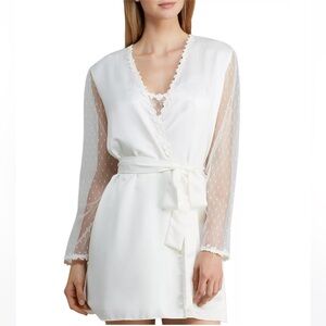 Sheer dot mesh contrasts add allure to this oh-so-feminine charmeuse wrapper from Flora Nikrooz.