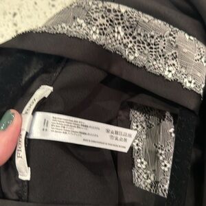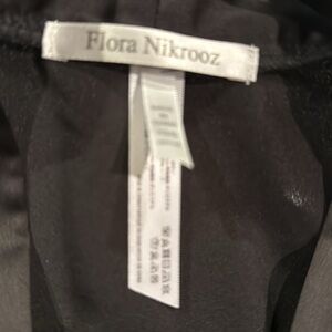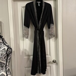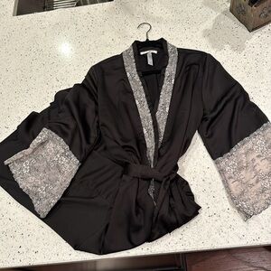 Gorgeous robe by Flora Nikrooz. size Xs/S in Black with the Beautiful lace trim on lower part of sleeves and down front. has inside tie and outside tie/Sash tie. 100% Polyester. this was purchased from Dillards 3 months ago by me. comes from a no smoking/No Pet home. Beautiful on!