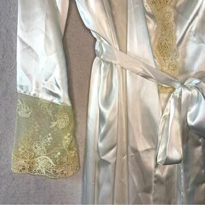 No flaws or wear visible. Excellent condition. White satin trimmed in Ivory lace. The robe has the belt attached at the back and also can tie shut on the inside. It has wide sheer lace at the ends of sleeves and is trimmed with lace in the front. The chemise has adjustable straps and a long slit at the hem (my finger points to this in one picture to show how high the slit is). The bust is covered in Ivory lace with a section that is sheer under the breast. The size of the slip is Large, and the size of the robe is S/M. Measurements below. Marking the listing as a Medium, as I think the robe works for this size as well as the slip. Please see measurements for proper fit.