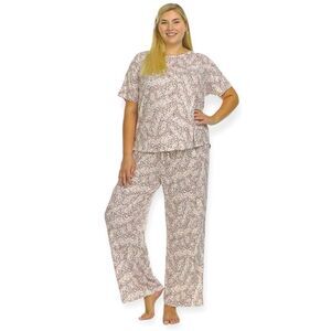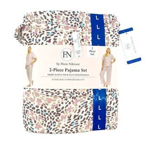 Flora Nikrooz Women’s Ivory Colorful Leopard Print 2-Piece Short Sleeve Top & Pants Pajama Set Large 10/12