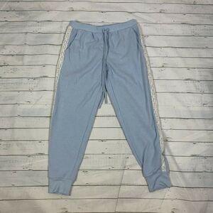 Flora Nikrooz carried at Anthropologie women's blue soft jogger pants with lace tuxedo stripe down leg. drawstring waist. some fuzzing/pilling to fabric.