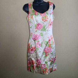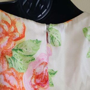 This is a sleeveless dress by Flora Kung. It is champagne colored with pink and orange floral print. On the back is a zipper. Note the green mark inside of the zipper as shown in photo 7.