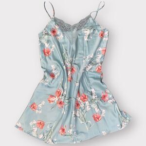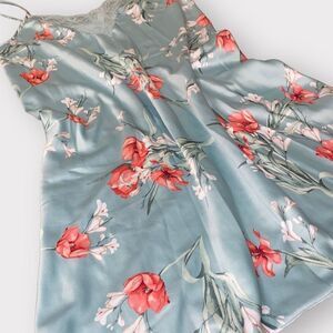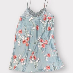 Pastel green base with light pink and white floral details throughout. Satin finish, adjustable spaghetti straps and a lace lined bust. Slip falls above the knee, fabric and lace are well intact with no stains or flaws to note.