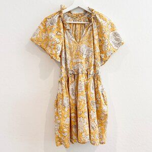 Floral 100% Cotton V-Neck Short Sleeve Ruffle Trim Flowy Mini Dress Boho Small