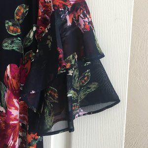 Floral A-line dress on a navy background. The colors of the floral are really pretty. I'm not normally a navy blue fan but the combo works so well and provides something different from the black or white background you usually see with floral. I would wear this dress for work, church, or a day time wedding (I wore it for a family portrait) It feature a double elbow to 3/4 length bell sleeve. It is a small but I'm a 10 and it fits fine, 18 1/2 inches armpit to armpit.