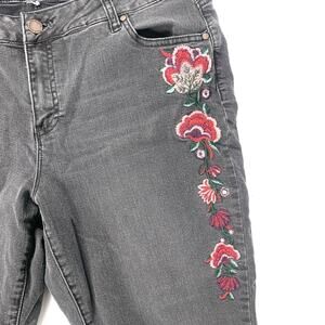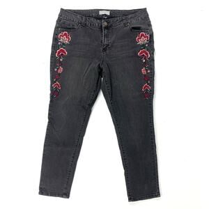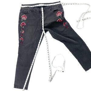 Falls creek black jeans with floral appliqué, no size tag, fits like XL, please see measurements for a good fit, gently worn overall good preowned condition