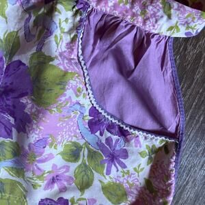 Charming floral apron. Features purple and green hues. Perfect for cooking or crafting.