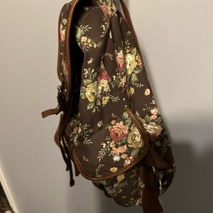 Floral backpack with a drawstring and snap close. 1 large compartment. Has 3 additional pockets that snap close.