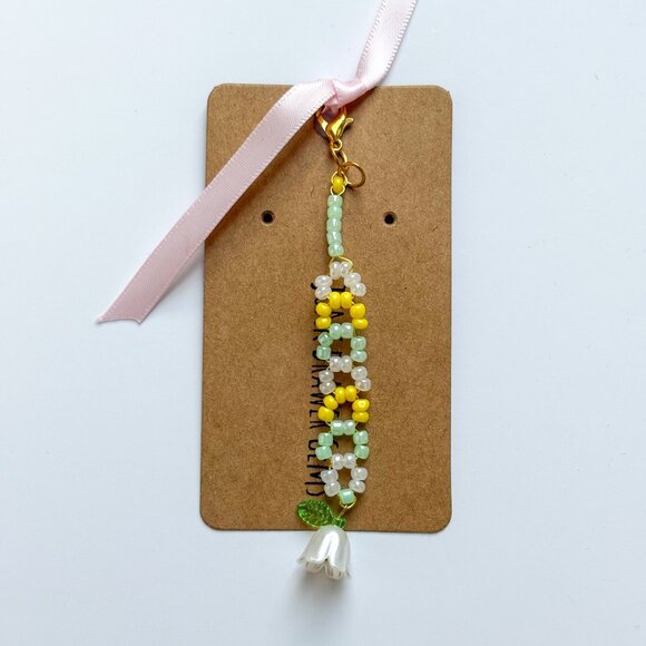 Handmade. Floral charm. Beaded white, mint and yellow. Perfect for keys, bags, and purses. Gold clasp. Pink ribbon is just to attach keychain to the cardboard backing.