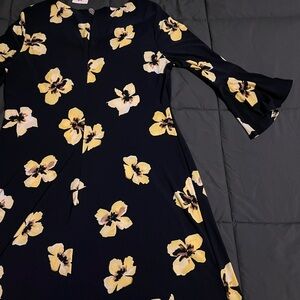 Chic dress with bell sleeves and floral pattern. Perfect for any occasion. I can’t really tell if this is black or a very dark navy blue. I feel like it is more black, but it is a color that is tough for my eyes to tell :(