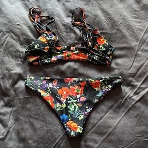Cheeky floral bikini, with snap back closure. Size M, runs small though. Has non-removable padding in top. Adjustable shoulder straps.