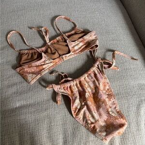 Stylish bikini set with floral patterns. Features a brown and pink color scheme. Perfect for beach days.