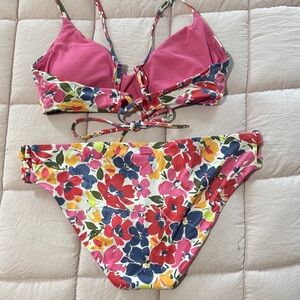 Bold floral bikini with vibrant colors. Ideal for beach fun. Bottoms are a L, top is a M.