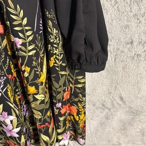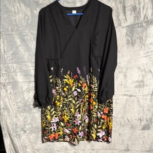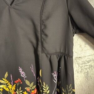 Elegant black dress featuring a vibrant floral print at the hem. Perfect for any occasion. This dress is in great preowned condition slip liner flowy over dress cute feminine cut