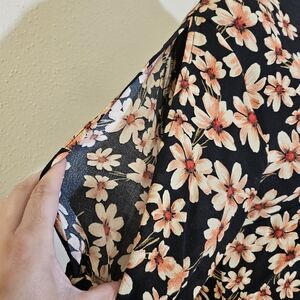 Jumpsuit in a daisy print with cap sleeve detail and cropped legs. 100% Viscose. Machine wash. In perfect condition, flawless, smoke and pet free home. V-neck, wrap front. missing belt, wide leg, cute ties on sleeves, cold shoulder. black, orange, and red
