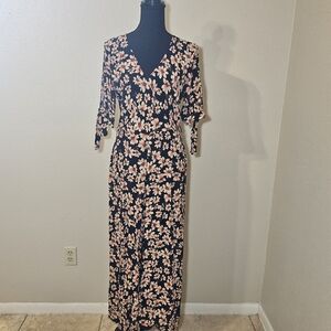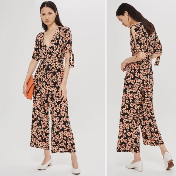 Jumpsuit in a daisy print with cap sleeve detail and cropped legs. 100% Viscose. Machine wash. In perfect condition, flawless, smoke and pet free home. V-neck, wrap front. missing belt, wide leg, cute ties on sleeves, cold shoulder. black, orange, and red