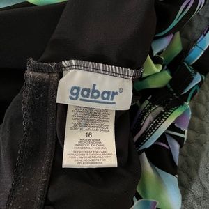 Stylish one-piece swimsuit featuring a vibrant floral design on a black background. Perfect for a chic beach look.
