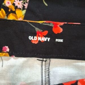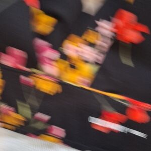 Stylish black pants with vibrant floral patterns. Features red, pink, and yellow flowers.