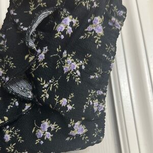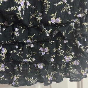 Chic and stylish floral black ruffle top with light purple flowers perfect for any occasion. Elastic lined ruffles and cropped top. Perfect with jeans!