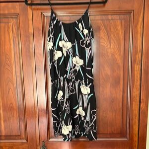 Tucker in pure silk Chic black romper with floral print. Features a sleeveless design.