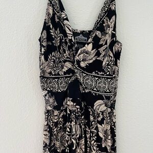 Elegant black and cream floral maxi dress perfect for any occasion. Features a flattering silhouette and intricate floral patterns. Ideal for both casual and formal events.