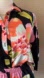 Stylish black matching set with vibrant floral patterns in pink, orange, and green. Features a button-up front and relaxed fit.
