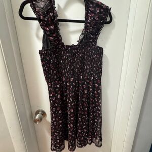 Chic sleeveless dress with a floral pattern. Features black and pink, and red colors. Perfect for casual outings.