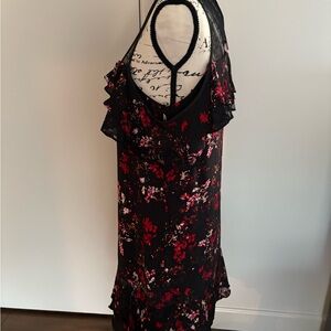 Elegant black dress with red floral pattern and sheer details. Perfect for a night out.