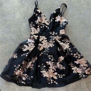 Elegant dress featuring a stunning black base with gold floral patterns. Perfect for special occasions. This one is a gem! Perfect condition. Pre-own