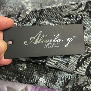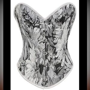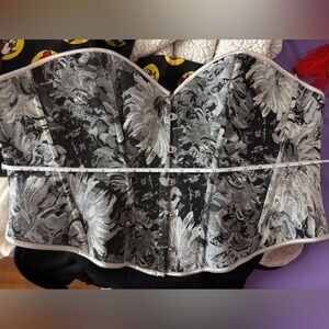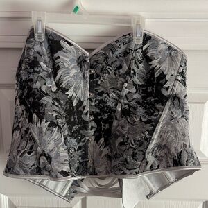 Stylish denim corset top with a floral pattern. Features a black and white design. New in packaging.