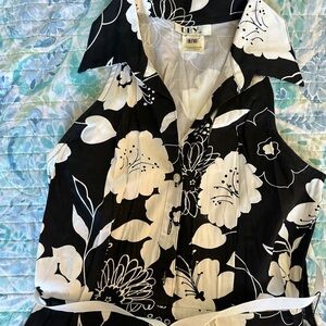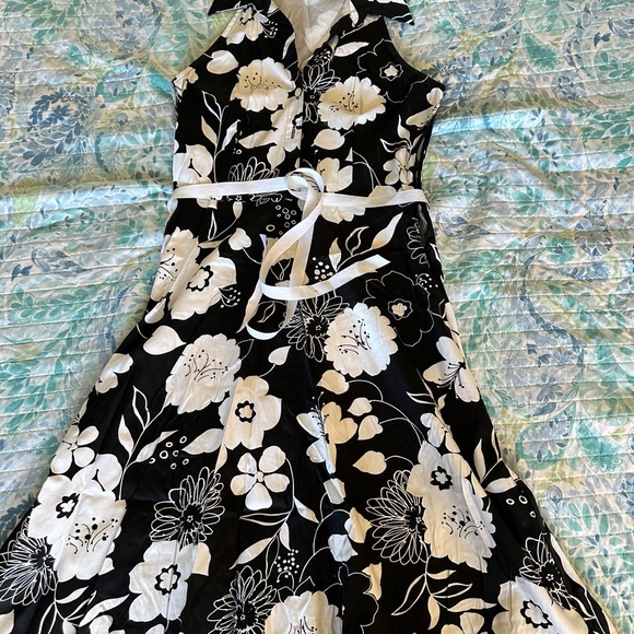 Elegant sleeveless dress featuring a striking black and white floral pattern. Perfect for any occasion.
