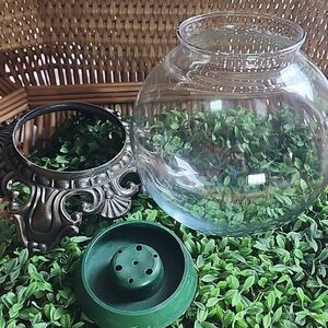 This vintage 3 piece set includes glass snow globe, water tight fitting and metal stand with brass tone