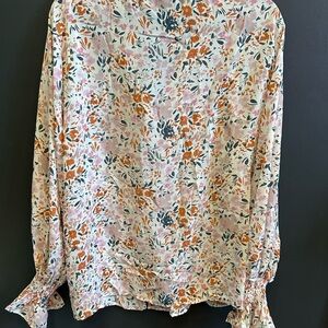 This elegant floral print top features a blend of pink and orange hues, perfect for adding a touch of color to your wardrobe. The lightweight fabric and stylish design make it ideal for any occasion.