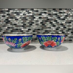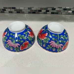 Beautiful ceramic bowls with vibrant floral design. Features blue background with pink flowers and green leaves.