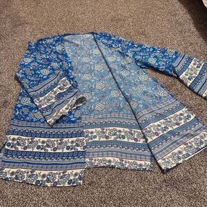 A long, open-front robe or kimono-style outerwear made from a light, flowy fabric. It features a rich, floral print dominated by shades of blue, accented with white and hints of purple and green.